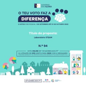 Apelamos ao vosso voto para a nossa Proposta n.º 94 – Laboratório STEAM apresentada no Orçamento Participativo dos Acores 2022, para a Ilha de São Miguel e na Categoria da Educação.