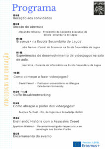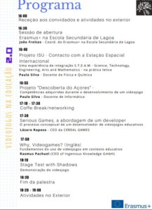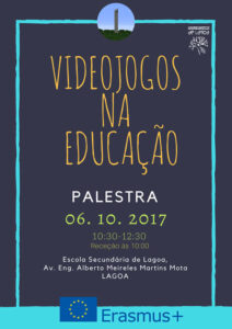 No dia 6 de Outubro teve lugar na Escola Secundária de Lagoa uma palestra relativa aos Videojogos na Educação, onde na sessão de abertura participaram, Alexandre Oliveira, Presidente do Conselho Executivo da ESL, João Freitas, Coordenador dos projetos Erasmus na ESL e José Silva, docente de informática da ESL. A palestra teve como oradores principais os especialistas em videojogos David Farrell, Rasmus Pechuel e Spyridon Blatsios.