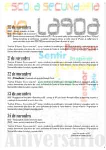 Durante a semana de 20 a 24 de novembro, o átrio da nossa escola sofrerá uma transformação, onde se pretende que sejam desenvolvidas várias atividades, como exposições, workshops, oficinas de reutilização, formação entre pares, sessões de cinema eco e outras.